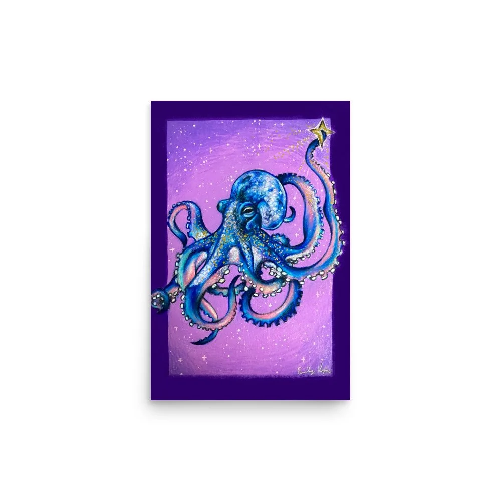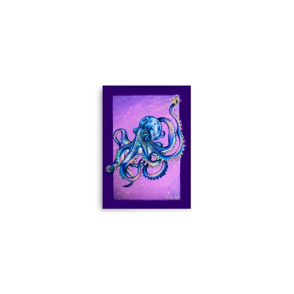 This piece is a reflection of fluidity, balance, and quiet strength. Inspired by the octopus—one of the ocean’s most intelligent and adaptive creatures—it captures the beauty of moving through life with ease and intention. Suspended between the sea and sky, the octopus exists in a dreamlike space where two worlds meet, symbolizing both depth and possibility.